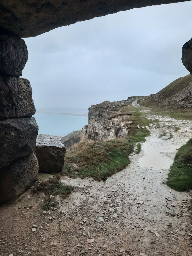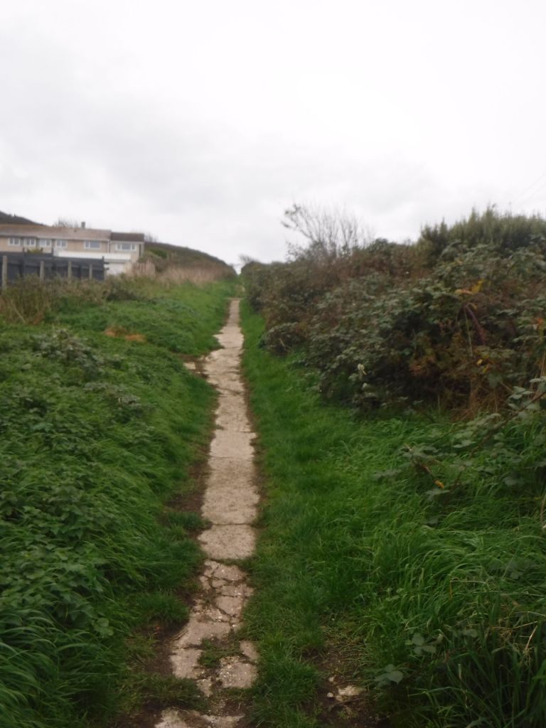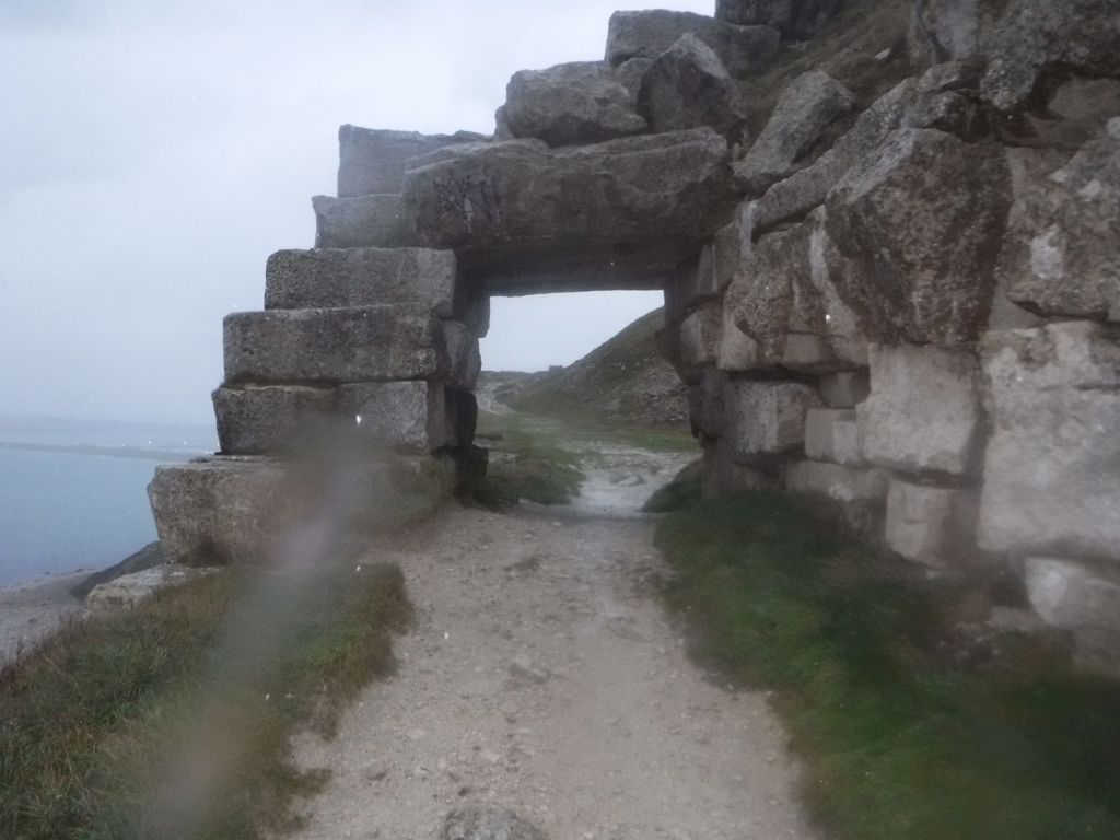The weather was changing, and almost on the strike of 4:30pm, the rain started. I had made good time and just reached the end of Portland Bill. I put my rucksack cover on, donned my coat, and headed north up the western side of the island. It was a bit of a climb up to top of cliff level, but once there, it was a pretty flat walk. I expect the views on a completely new (to me) coastline would have been great. Unfortunately, there was just a grey mist. The rain got so heavy I had to put my waterproof trousers on, a rare occurrence as I get wetter on the inside when I wear them.