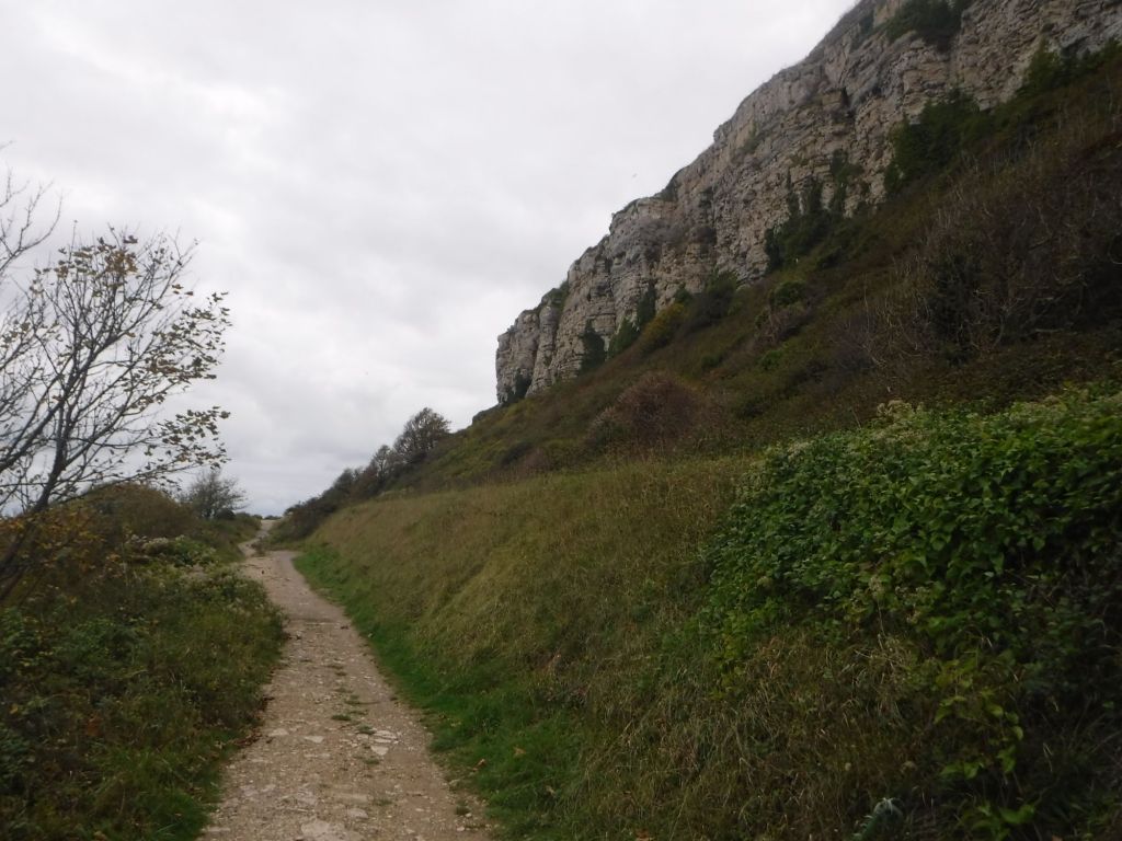 I then dropped sharply down narrow footpath and through a series of hairpin bends. At one point I had to wade through piles of full size apples blocking the path. I think an apple tree may have escaped from the prison above (I really should have taken a picture). The narrow path dropped on to a main path that took me miles, just above the sea with the portland stone cliffs above.