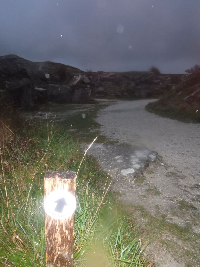 The path was easy to follow as the light diminished and the cliff top route would have been spectacular with good visibility. The path then went through some old quarries. I came to a big stone arch, which was my first opportunity to check the map on my phone. I’d forgotten to bring the waterproof cover for it (but had brought spare headtorch batteries, so I can learn!). I also called the accommodation to give them my eta.